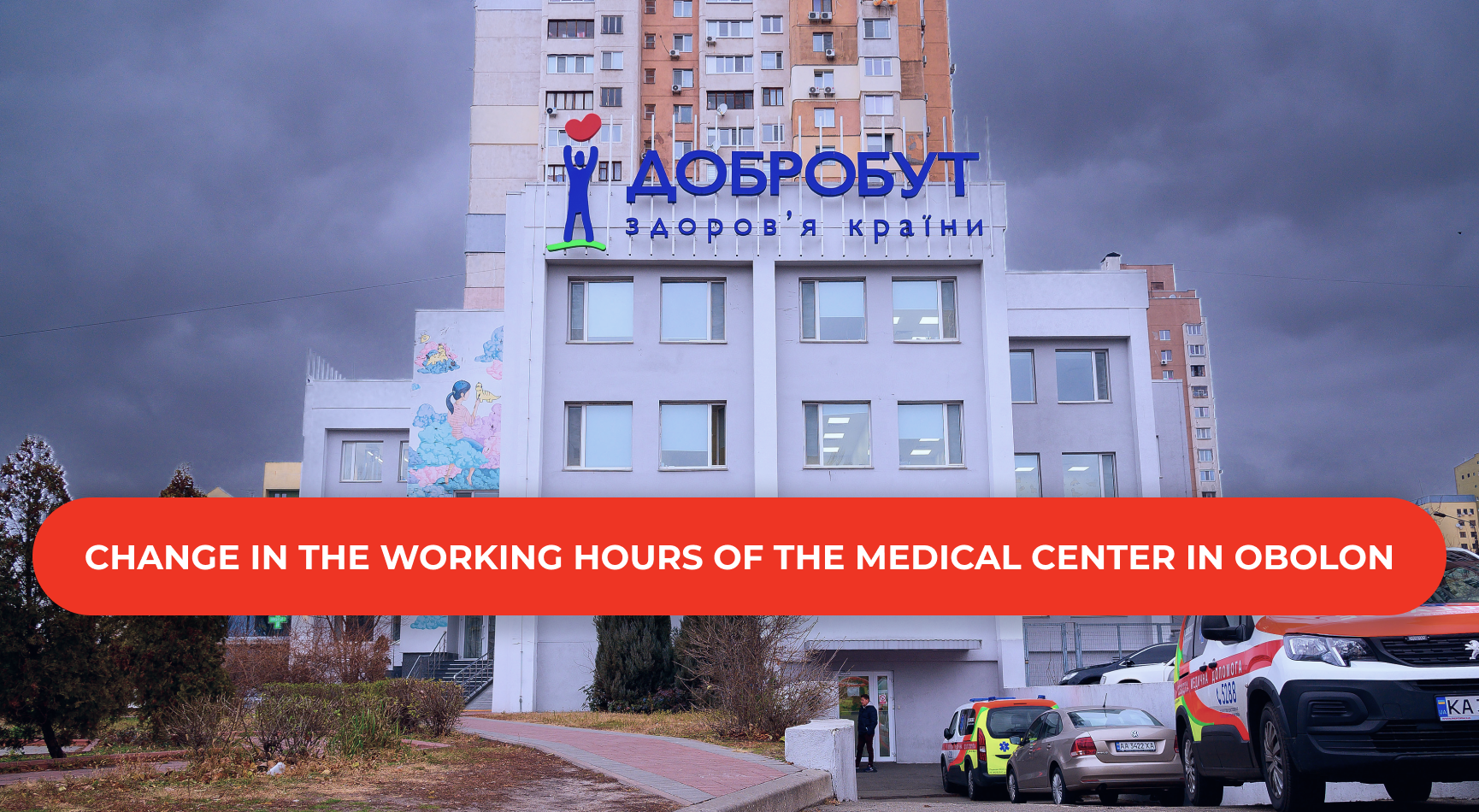 The Dobrobut Medical Center at 16-B Volodymyr Ivasiuk (Heroes of Stalingrad) Avenue will be closed for technical reasons from 5:00 PM on December 13 to 8:00 AM on December 17.