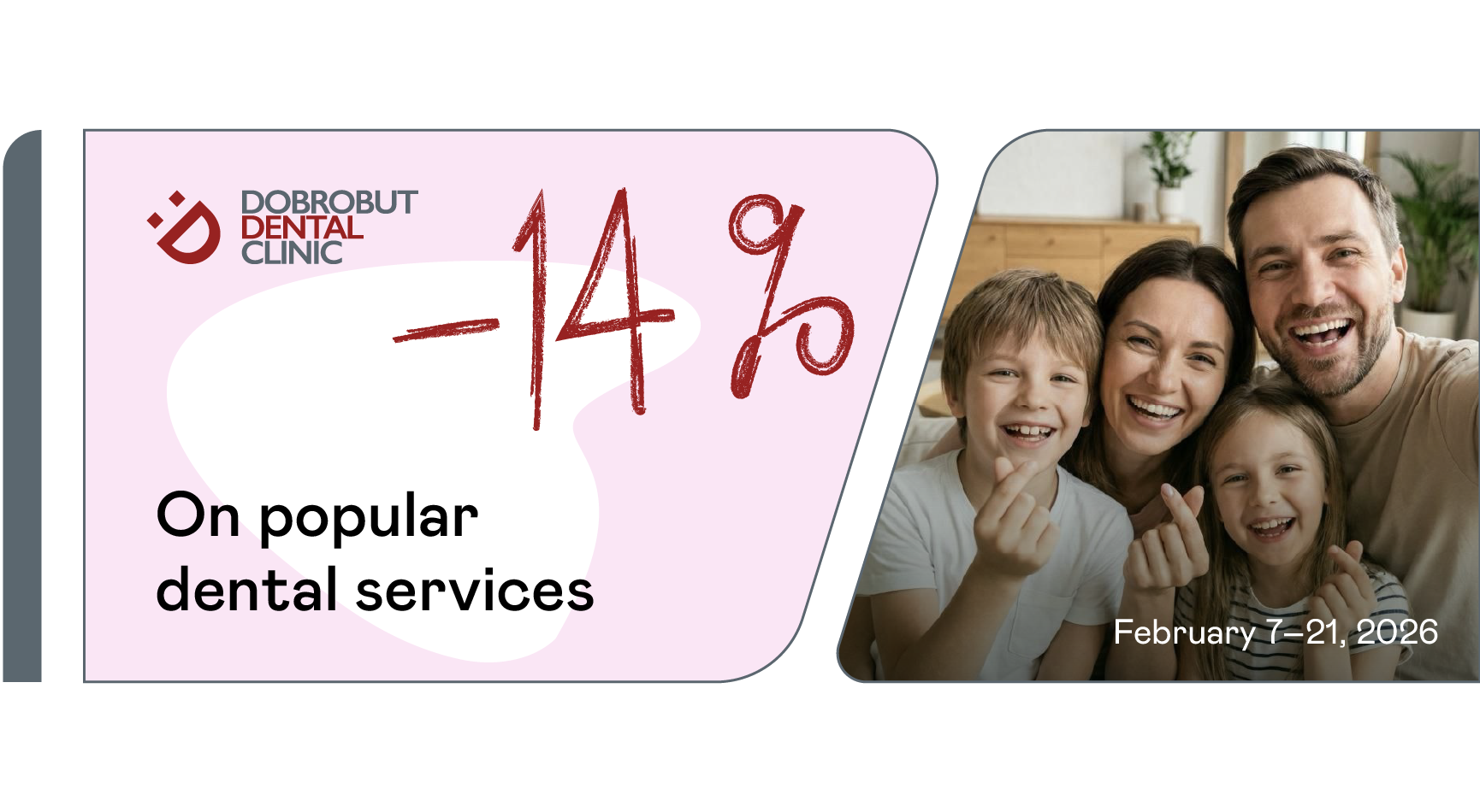 From February 7 to 21, Dobrobut Dental Clinic offers a special Valentine’s Day promotion: a 14% discount for all patients on selected dental services.