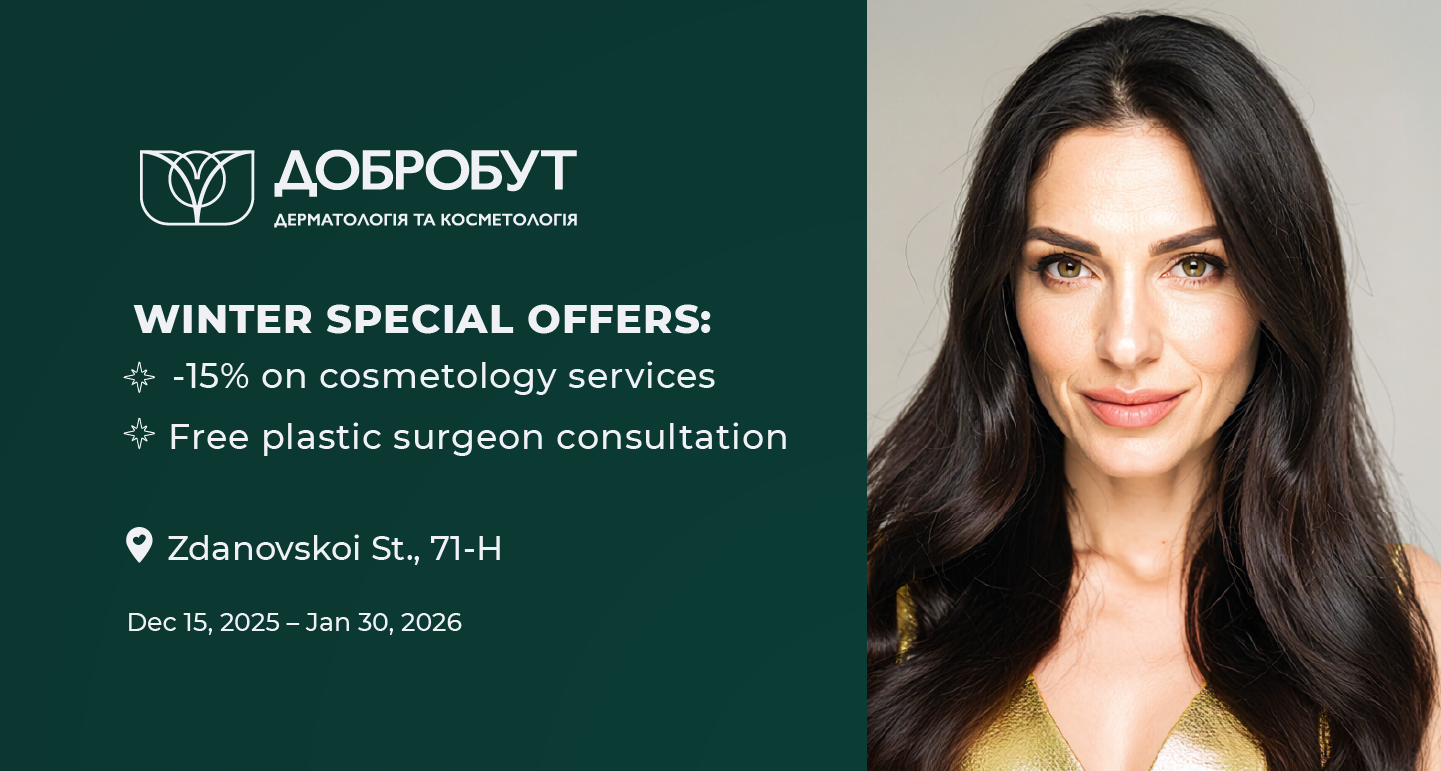 From Dec 15, 2025 to Jan 30, 2026, Dobrobut Clinic presents a winter offer at the Center of Dermatology and Cosmetology: 15% off selected cosmetology procedures and a free plastic surgeon consultation.