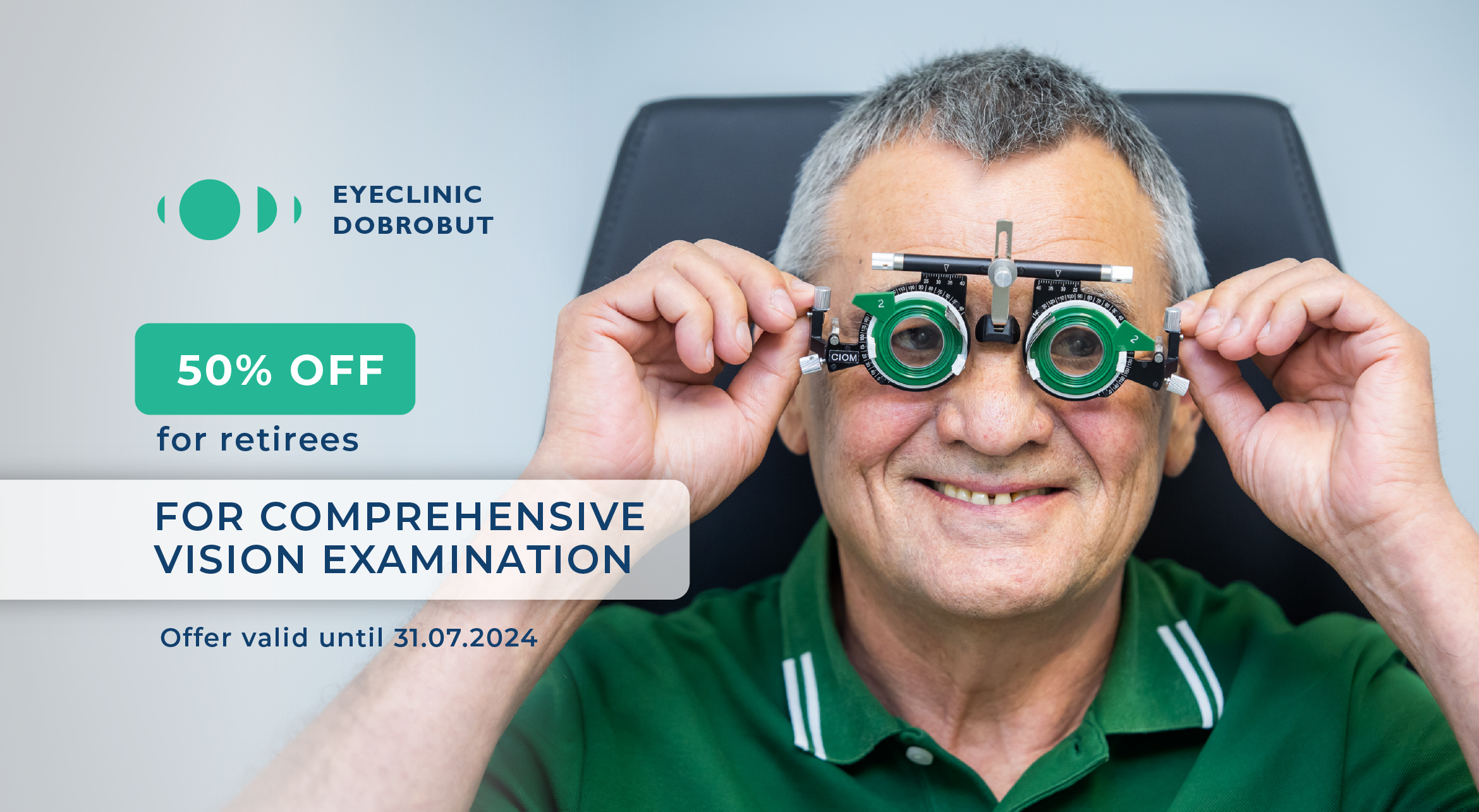 Until July 31, 2024, the Dobrobut Eye Clinic will have a special offer - a 50% discount on a comprehensive ophthalmological examination for pensioners.