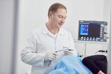 The postoperative period is almost painless. Anesthetics are recommended for 1-3 days. Procedures can be performed under general or local anesthesia. We recommend hospitalization for 12-24 hours for maximum comfort and patients' health safety. In 2 hours after the procedure a patient can get up, walk and eat and in 3-4 days return to daily routine.