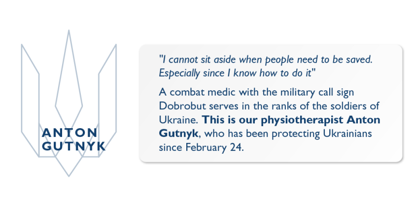 When the full-scale war began, Anton joined the volunteer medical battalion of the Hospitaliers, later he was mobilized as a combat medic to a special military unit. He previously trained to provide medical care on the battlefield in tactical medicine courses.