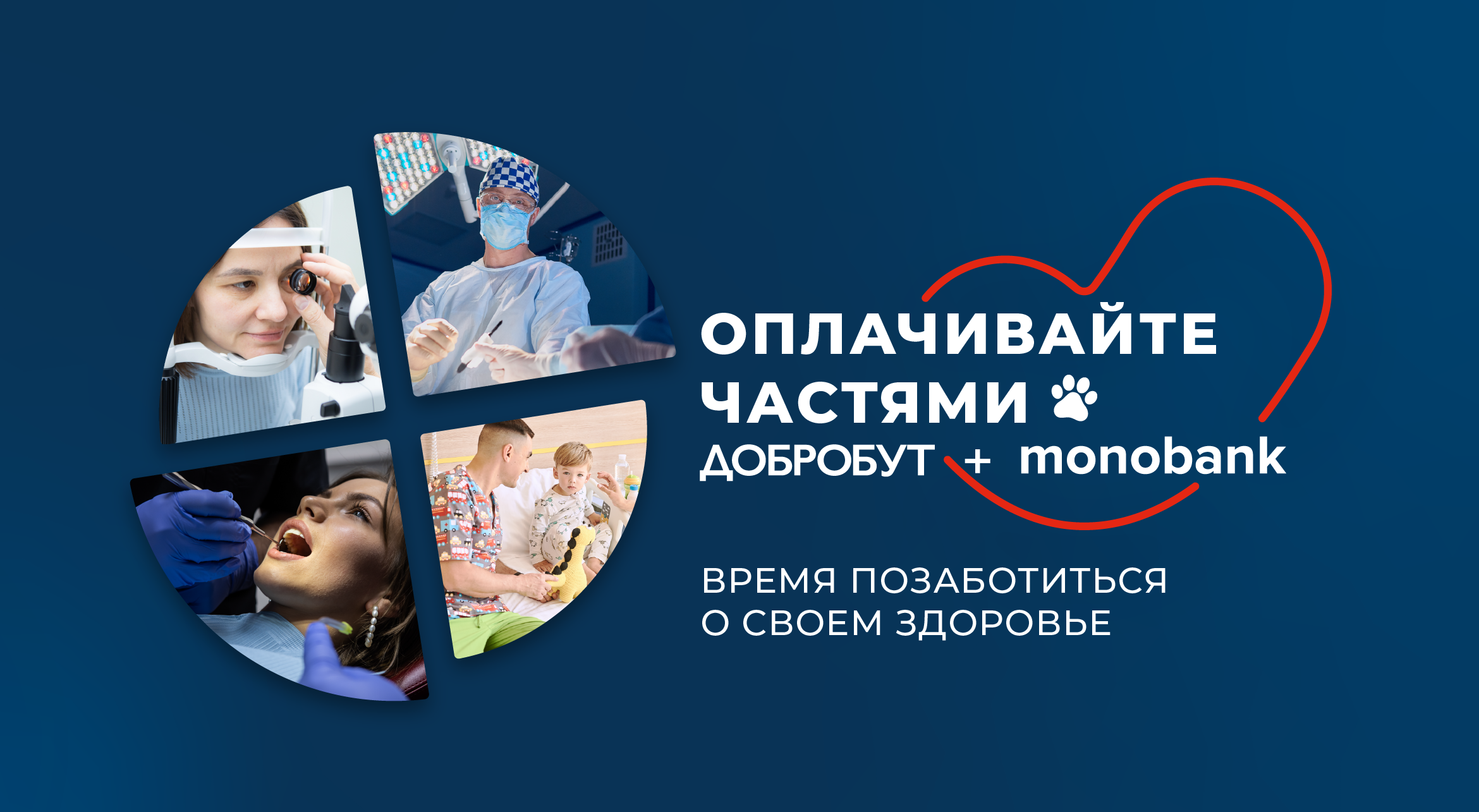 Мы заботимся о вашем здоровье и комфорте, особенно в такие непростые времена. Добробут вместе с Monobank предлагает новый удобный способ оплаты медицинских услуг в сети: оплату частями. Получите качественную медицинскую помощь и оплачивайте ее удобным количеством платежей без процентов и переплат.