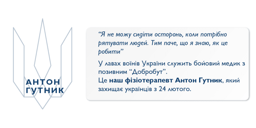 Антону 23 роки, до команди «Добробуту» він долучився рік тому, щоби допомагати відновити здоров’я пацієнтам, що пережили травми, складні операції та тяжкі хвороби. На питання, чому позивний саме «Добробут», Антон відповідає просто: «Я дуже любив свою роботу».
