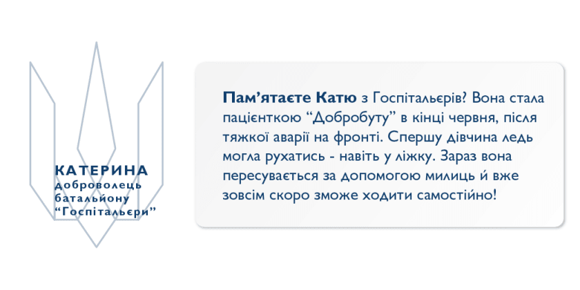 Катя — дитячий анестезіолог та медик Медичного Добровольчого Батальйону «Госпітальєри». Під час нічного виїзду на евакуацію поранених вона разом із командою потрапили в ДТП. Катю госпіталізували до шпиталю «Добробут» в Києві з тяжкими травмами ніг, закритим переломом тазу, травмами нирки та грудної клітини.