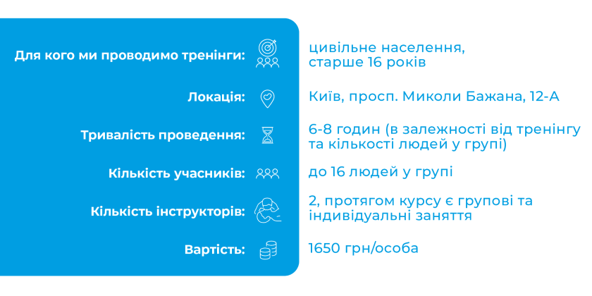 Пропонуємо вам обрати один із наших тренінгів з домедичної допомоги, аби в екстремальних ситуаціях зуміти врятувати себе та людей, що поруч.